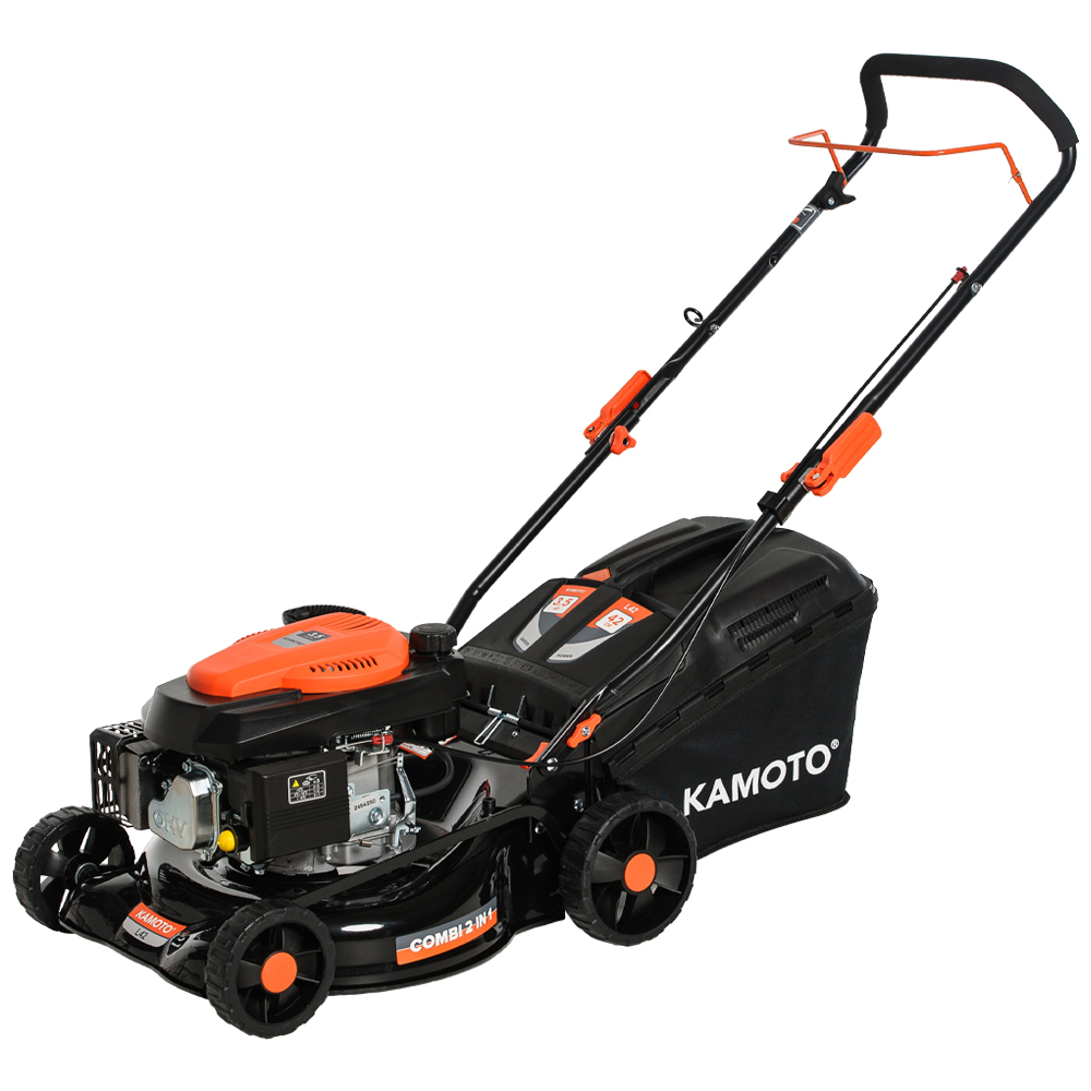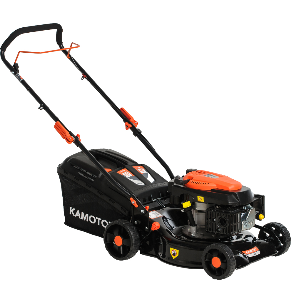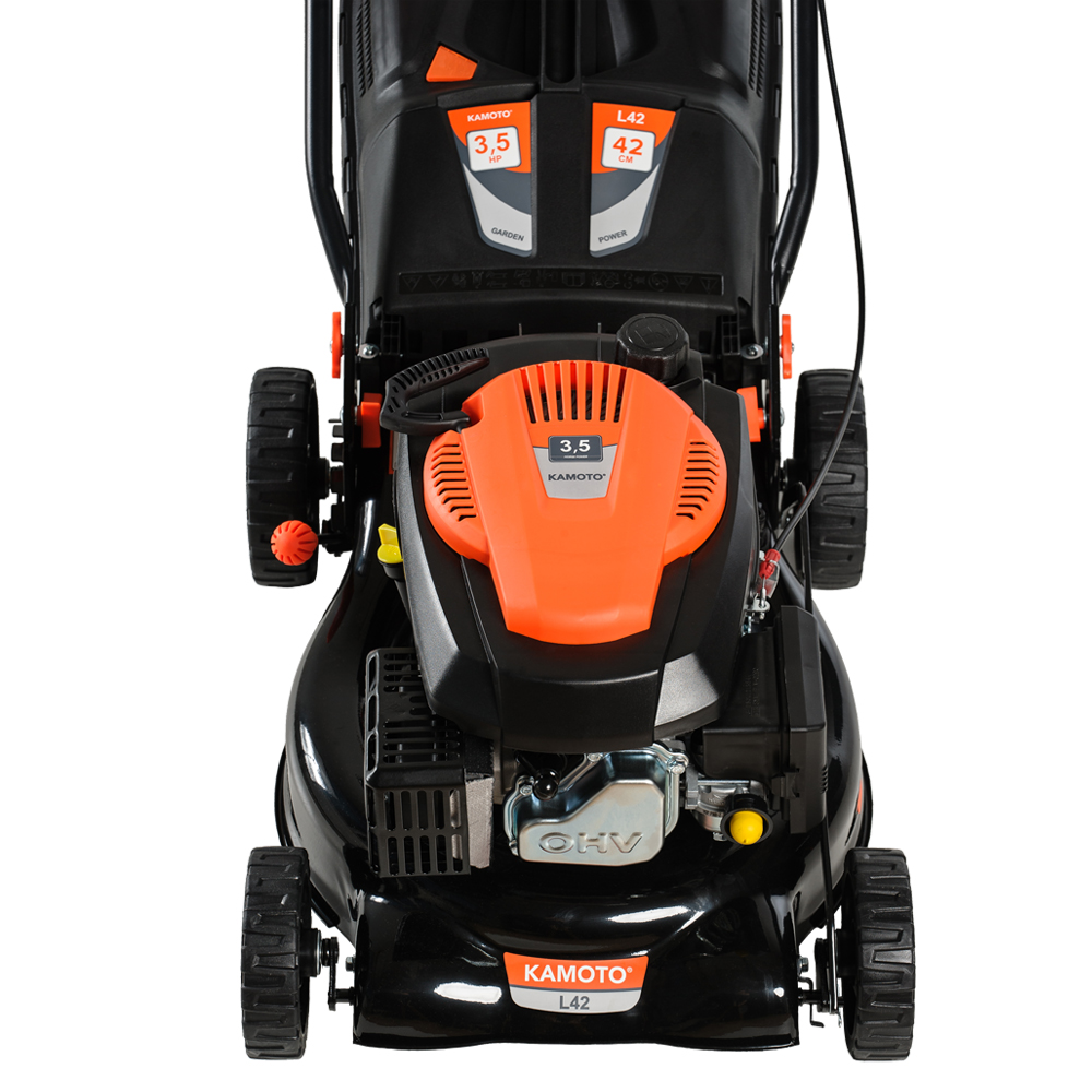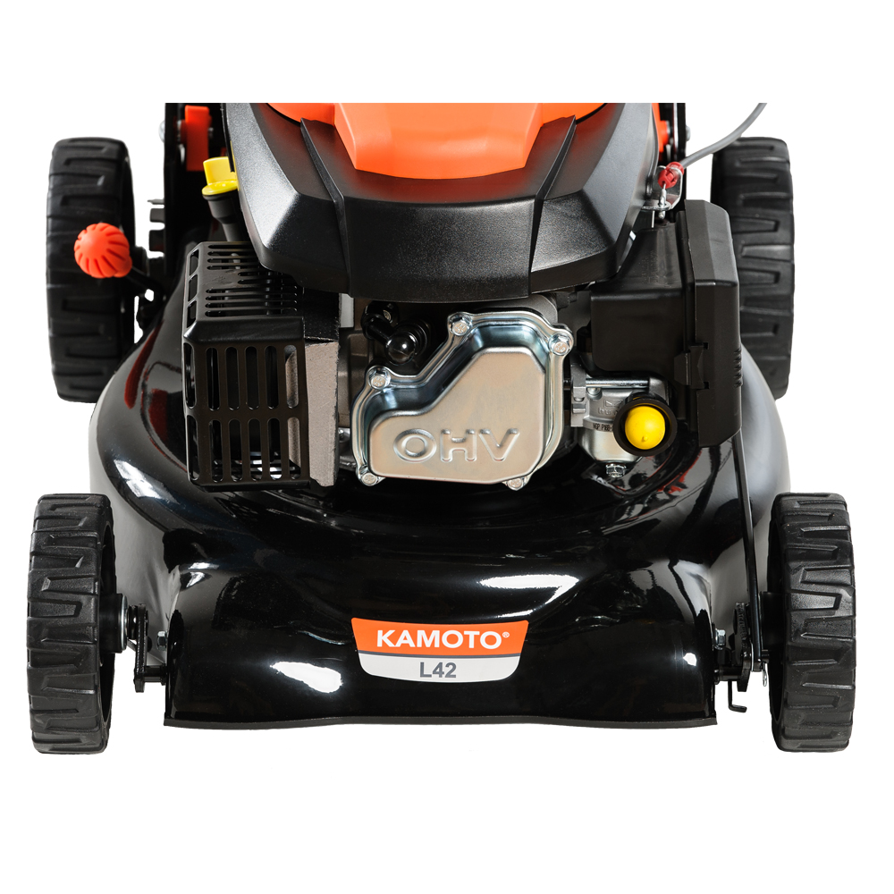 Бензиновая газонокосилка Kamoto L42 с четырехтактным двигателем мощностью 3,5 л.с. и с изменяемой высотой скашивания предназначена для срезания и сбора травы на ровной площади средних и больших участках, общей площадью не более 1800 — 2000 кв.м. Осенью, газонокосилку можно использовать также и для сбора опавшей с деревьев листвы.